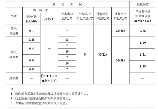 蒸汽和熱水型溴化鋰吸收式冷水機組名義工況如下表所示——《蒸汽和熱水型溴化鋰吸收式冷水機組》 GB/T 18431-2001。