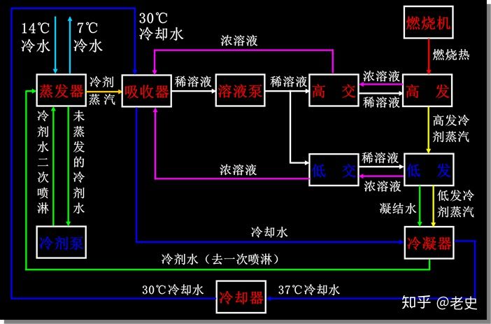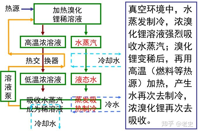 稀溴化鋰溶液在發(fā)生器內(nèi)被熱源加熱,產(chǎn)生水蒸汽和濃溴化鋰溶液。水蒸汽通過冷凝器變成冷劑水,冷劑水進(jìn)入蒸發(fā)器這個(gè)高真空環(huán)境驟然降溫,然后噴灑到制冷銅管上蒸發(fā)吸收銅管內(nèi)空調(diào)水的熱量,達(dá)到制冷目的。冷劑水蒸發(fā)后變成水蒸汽,在吸收器被來自發(fā)生器的濃溴化鋰溶液吸收,釋放出的熱量(即室內(nèi)熱量)被冷卻水銅管內(nèi)的冷卻水帶走排放到大氣中。變稀的溶液被溶液泵送到發(fā)生器,再次被加熱,再次產(chǎn)生水蒸汽……循環(huán)不已。